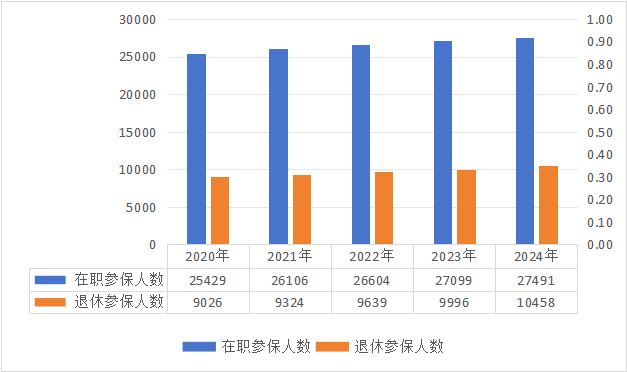 1.參保人數(shù)。截至2024年底,職工醫(yī)保參保37948.34萬人,比上年增加853.70萬人,增長2.3%。其中在職職工27490.84萬人,退休職工10457.50萬人。